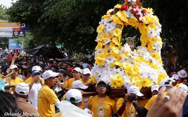 Con la caída del sol, la imagen entra en la iglesia de Santo Domingo, en Managua, donde es recibida por una multitud de fieles, quienes le rezan y bailan. Durante los siguientes diez días, la capital nicaragüense vive un ambiente de jolgorio con estallido de petardos, música folclórica interpretada por “chicheros”, y marimbas de arco, instrumentos que llegaron siglos atrás de África.
