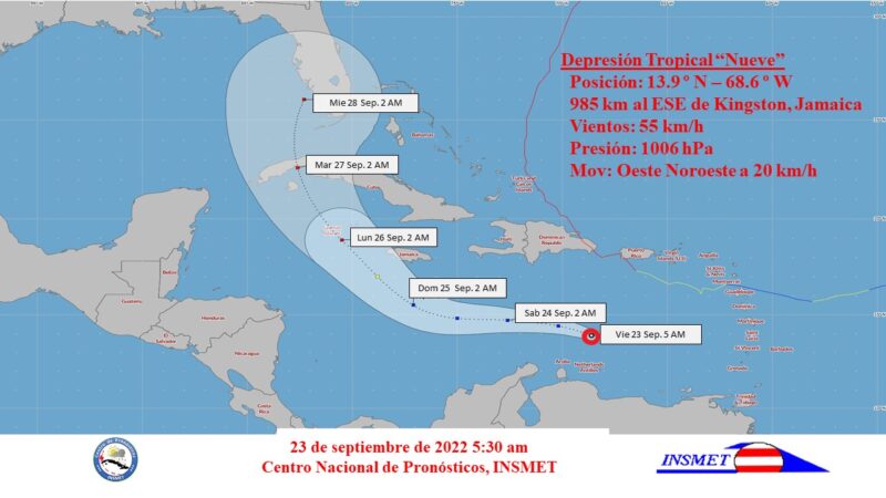 Washington, depresión tropical de la actual temporada ciclónica avanza por el Caribe central rumbo oeste y podría convertirse en tormenta esta noche, informó hoy el Centro Nacional de Huracanes.