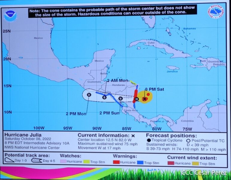 El Ingeniero Marcio Baca, Director de Meteorología del INETER, dijo que Julia estará impactando Nicaragua en categoría de Huracán y atravesará todo el territorio nacional, desde El Caribe hasta el Occidente de Nicaragua con la intensidad, seguramente de tormenta tropical.