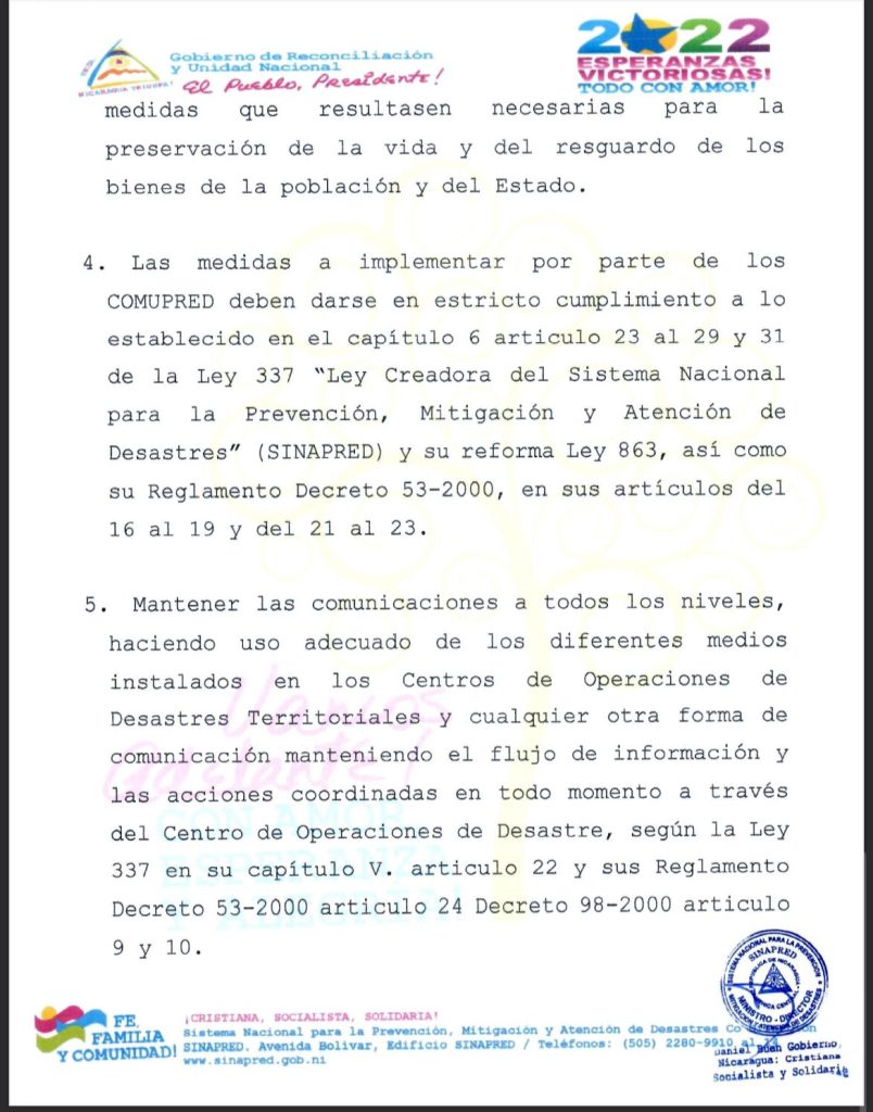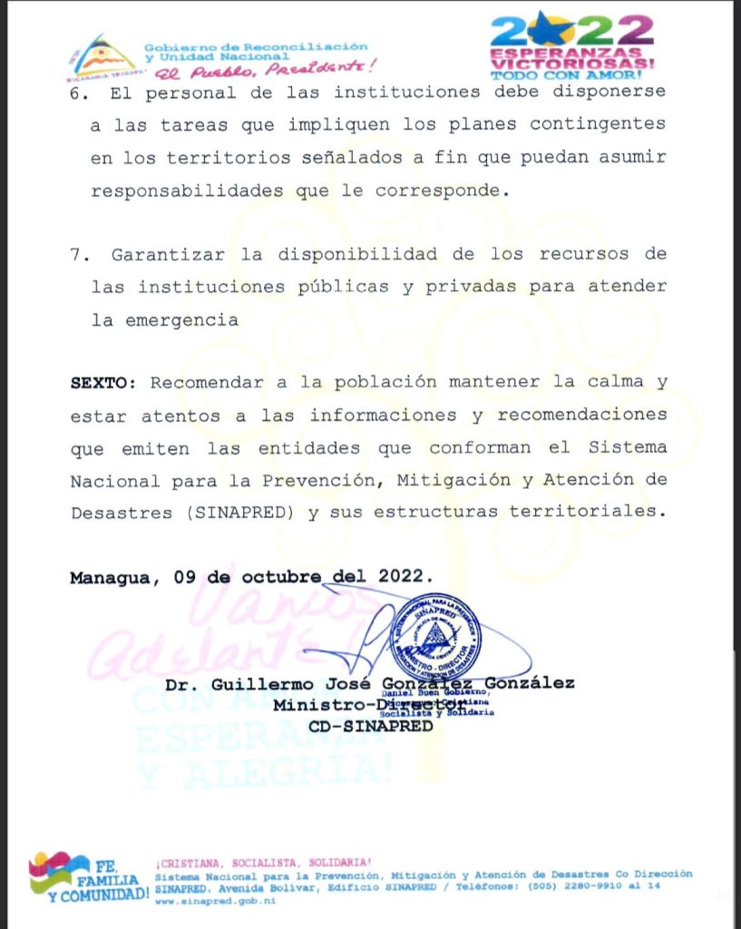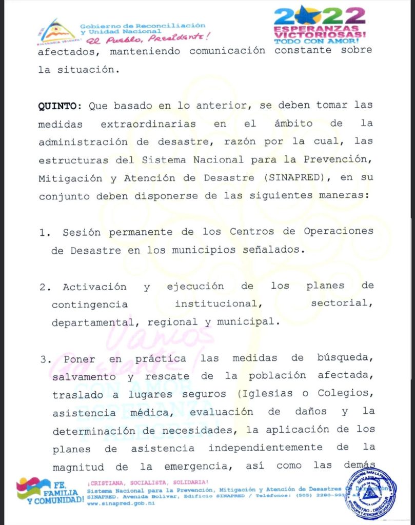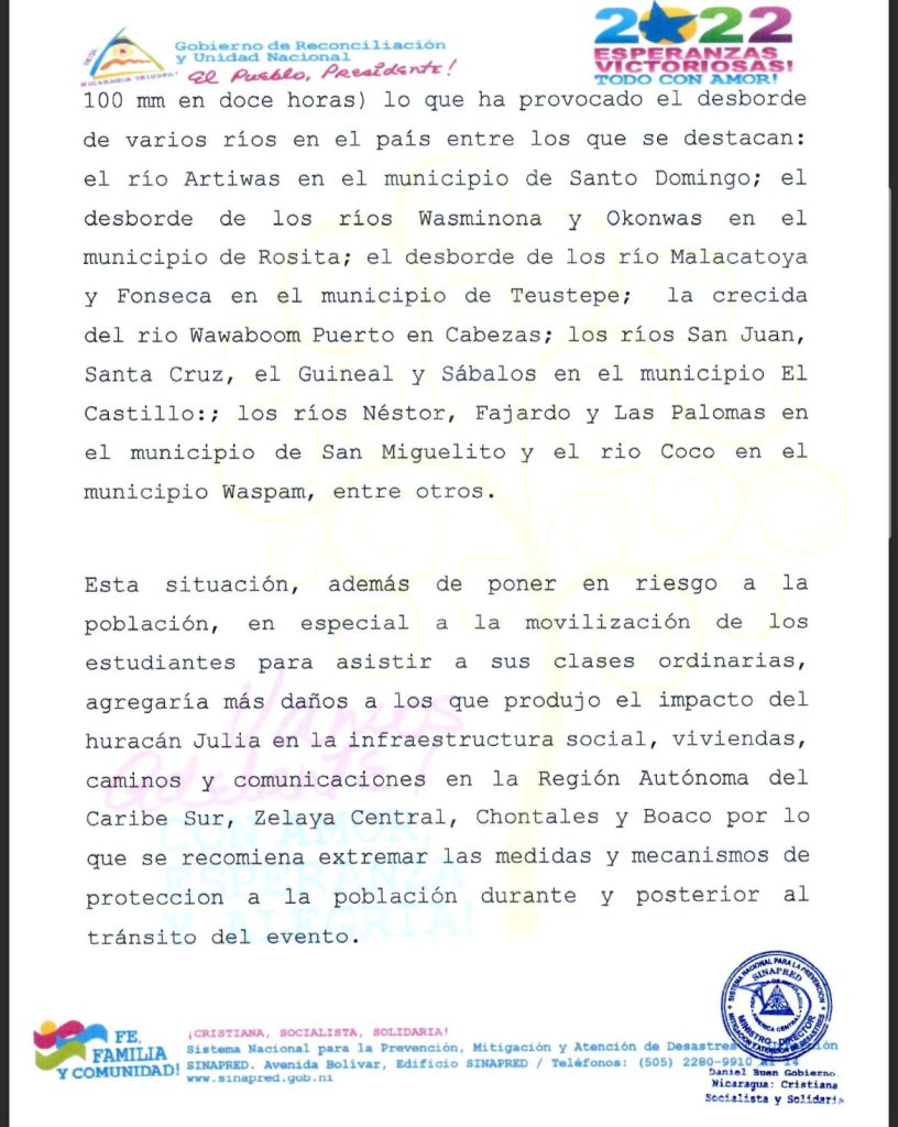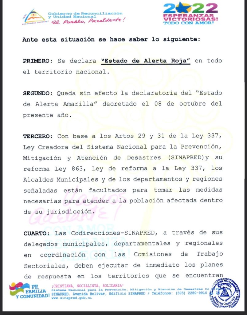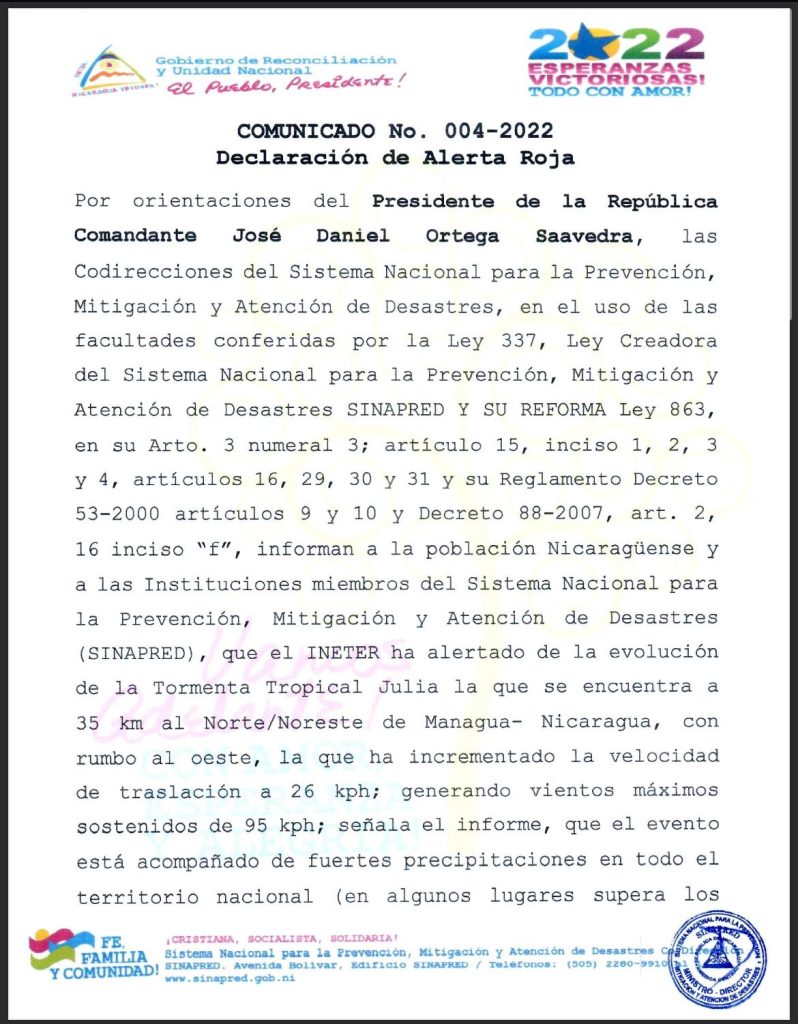 El Gobierno de Nicaragua declara «Estado de Alerta Roja» en todo el territorio nacional, por el paso de la tormenta tropical Julia.