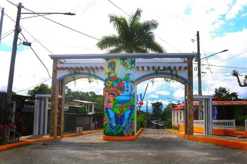 La entrada ahora cuenta con columnas enchapadas, pérgolas, caseta de control, andenes, instalación de cámaras de seguridad y pinturas artísticas que destacan con la flora y fauna característica del municipio, así como, laboriosidad de las Mujeres que se dedican al cultivo y producción de plantas y flores.