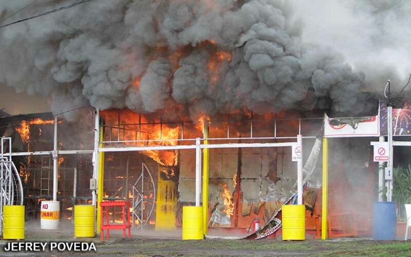 Los Bomberos Unidos movilizaron unidades para sofocar el incendio que está afectando 9 tramos dedicados a la venta de pólvora.