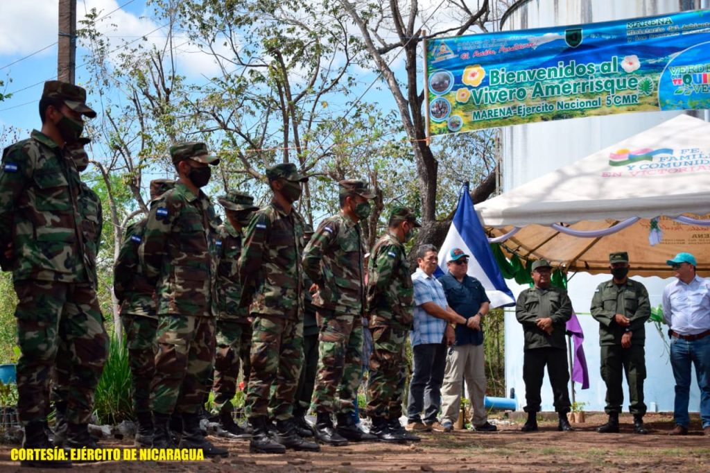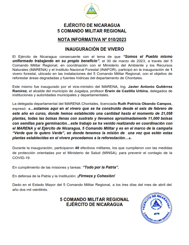 El Ejército de Nicaragua consecuente con el lema de que “Somos el Pueblo mismo uniformado trabajando en su propio beneficio”, el 30 de marzo de 2023, a través del 5 Comando Militar Regional, en coordinación con el Ministerio del Ambiente y los Recursos Naturales (MARENA) y el Instituto Nacional Forestal (INAFOR), participó en la inauguración de 1 vivero forestal, ubicado en las instalaciones del 5 Comando Militar Regional, con el objetivo de reforestar áreas degradadas y fuentes hídricas del departamento de Chontales.