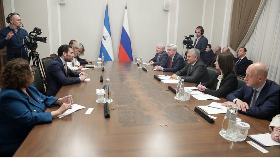 Una Delegación del Gobierno de Nicaragua se ha reunido hoy Lunes 22 de Mayo con el Compañero Vyacheslav Volodin, Presidente de la Duma Estatal de la Federación de Rusia. La Delegación nicaragüense la componen los Compañeros Laureano Ortega Murillo, Asesor Presidencial; Iván Acosta, Ministro de Hacienda y Crédito Público y Alba Torres, Embajadora de Nicaragua.