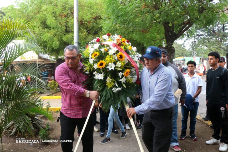 Autoridades de la Alcaldía de Ciudad Sandino, en conjunto con la Juventud Sandinista 19 de Julio, la Federación de Estudiantes de Secundaria y la población en general, depositaron ofrendas florales en el monumento a la memoria del combatiente Marlon Zelaya.