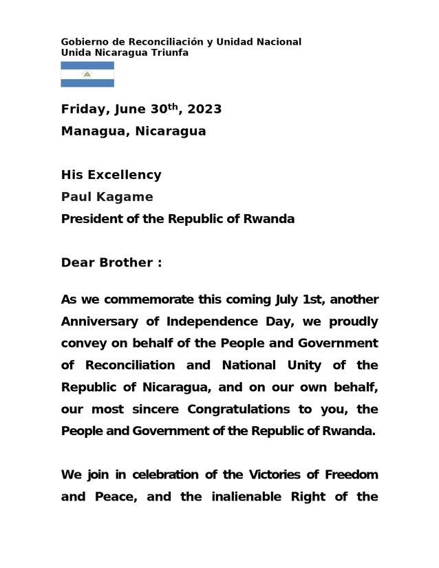 Al conmemorar el próximo 1° de Julio, otro Aniversario más del Día de la Independencia, transmitimos con orgullo en nombre del Pueblo y Gobierno de Reconciliación y Unidad Nacional de la República de Nicaragua, y en nuestro propio nombre, nuestras más sinceras Felicitaciones a usted, al Pueblo y Gobierno de la República de Ruanda.