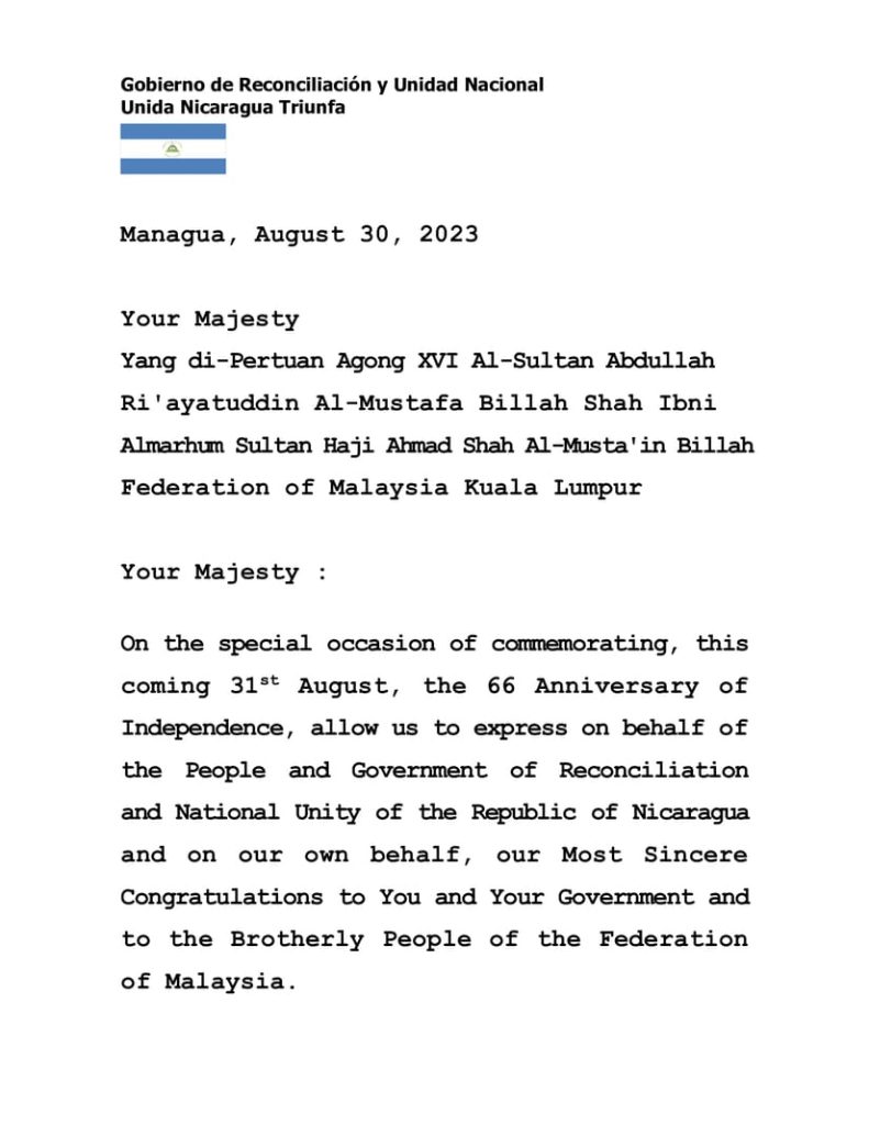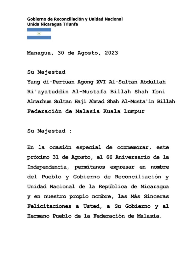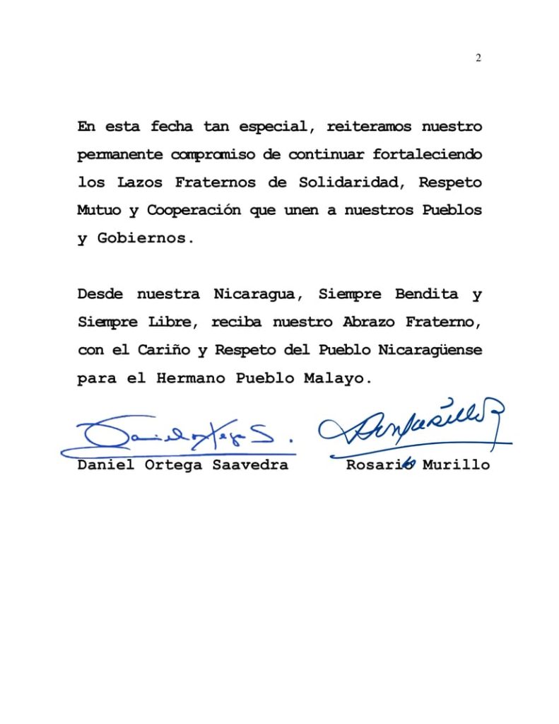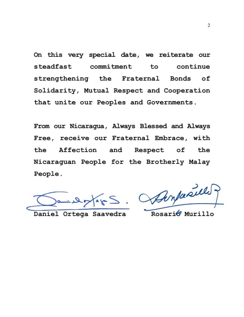En la ocasión especial de conmemorar, este próximo 31 de Agosto, el 66 Aniversario de la Independencia, permítanos expresar en nombre del Pueblo y Gobierno de Reconciliación y Unidad Nacional de la República de Nicaragua y en nuestro propio nombre, las Más Sinceras Felicitaciones a Usted, a Su Gobierno y al Hermano Pueblo de la Federación de Malasia.