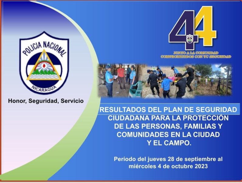 La Policía Nacional informa que durante este período se logró la captura de 34 delincuentes por delitos de peligrosidad, y se incautaron 5 kilogramos con 841 gramos de cocaína, 10 libras de marihuana, 9 armas de fuego, 5 vehículos, 36 animales y 254.4 pies cúbicos de madera. Todos los delincuentes y evidencias fueron entregados a las autoridades competentes.
