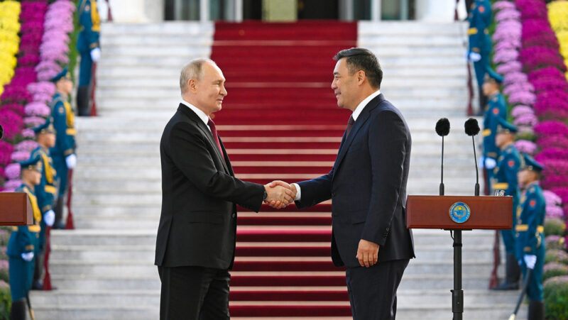Su homólogo de Kirguistán, Sadyr Zhapárov, recibió Putin en el pabellón situado frente a la residencia presidencial Ala Archa.
