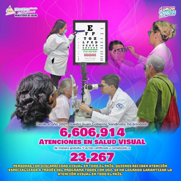 Desde el año 2007 al 2023, nuestro Buen Gobierno Sandinista ha certificado y carnetizado a 23,267 personas con discapacidad visual en todo el país, quienes reciben atención especializada a través del Programa Todos con Voz. Asimismo, se han brindado 6,606,914 atenciones en salud visual, detalladas a continuación:
