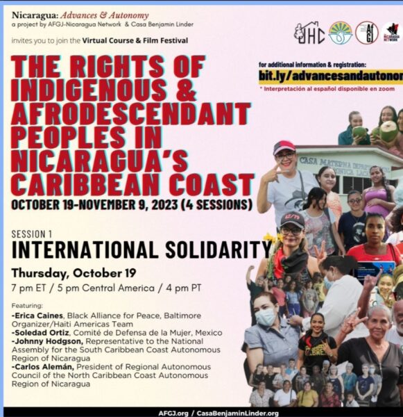 Este Jueves 19 de Octubre del 2023, Compañer@s de la Solidaridad con nuestro Pueblo y Gobierno; de la Alianza por la Justicia Global; y de la Alianza Negra por la Paz, realizaron el Seminario Virtual “Los Derechos de los Pueblos Indígenas y Afrodescendientes en la Costa Caribe de Nicaragua”.