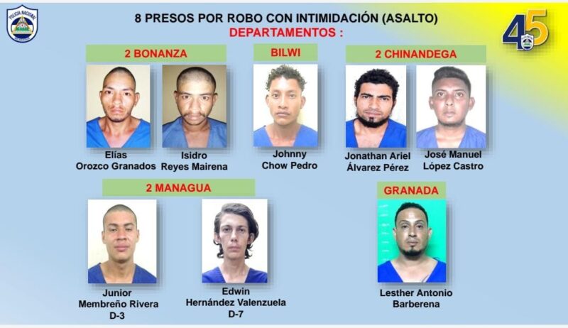 En cuanto a delitos de robo con intimidación o asalto, se arrestó a 1 individuo en Managua y a otros 8 en diferentes departamentos, donde se confiscaron un total de 5 armas de fuego como evidencia incriminatoria. Todos los detenidos y evidencias han sido remitidos a las autoridades pertinentes para su procesamiento legal.