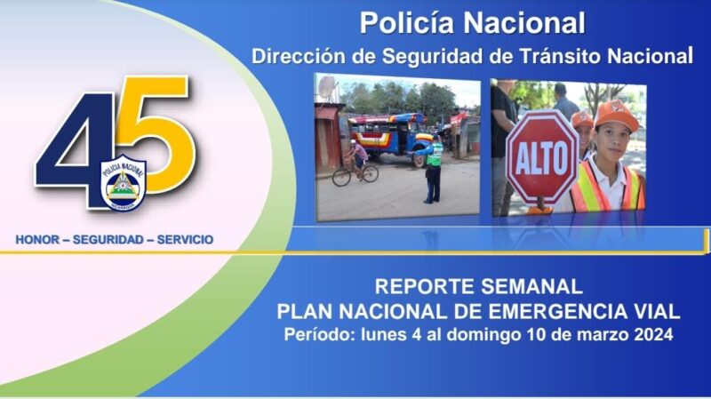 Según informe de la Policía Nacional, la Dirección de Seguridad de Tránsito Nacional, reportó 1 mil 047 colisiones en el período comprendido del lunes 4 al domingo 10 de marzo del 2024, como parte del Plan Nacional de Emergencia Vial.