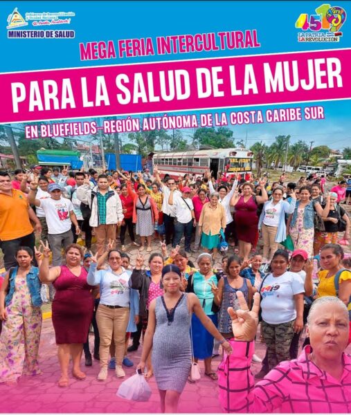 Gobierno Sandinista, brindó 8,498 atenciones en salud a 5,517 Mujeres de los municipios Laguna de Perlas, Kukra Hill, Desembocadura del Río Grande, La Cruz de Río Grande, El Tortuguero y Bluefields, las protagonistas pertenecen a los pueblos Miskitus, Creolle, Ulwuas, Garífunas, Ramas y Mestizas; esto a través de una Mega Feria Intercultural para cuidar la Salud de las Mujeres, que se realizó este sábado 16 de marzo, en el