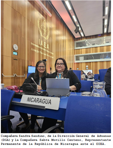 La Delegación del Gobierno de Nicaragua estará representada por la Compañera Sandra Sandino, de la Dirección General de Aduanas, DGA, y la Compañera Sabra Murillo Centeno, Representante Permanente de la República de Nicaragua ante el OIEA.