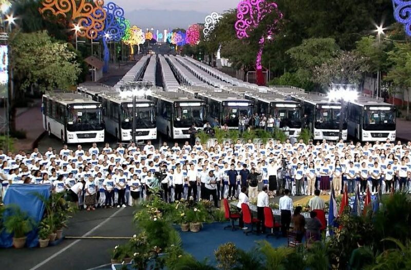 El Copresidente Comandante Daniel Ortega y la Copresidenta Compañera Rosario Murillo, entregaron una nueva flota de buses y microbuses procedentes de la República Popular China. La ceremonia fue realizada este 8 de marzo en la Rotonda Comandante Hugo Chávez, el Gobierno sigue mostrando su compromiso por mejorar la movilidad y calidad de vida de las familias nicaragüenses.