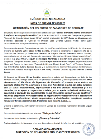 El Ejército de Nicaragua consecuente con el lema de que “Somos el Pueblo mismo uniformado trabajando en su propio beneficio”, el 2 de abril de 2025, a través del Cuerpo de Ingenieros “General de Brigada Miguel Ángel Ortez”, realizó graduación del XIV Curso de Zapadores de Combate, dedicada al “General de División José Dolores Estrada Vado”, como justo reconocimiento a su legado histórico y patriótico.