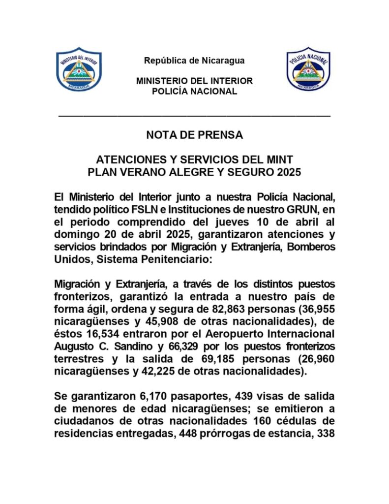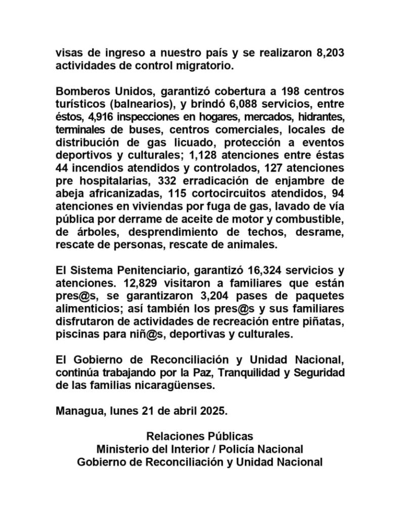 El Ministerio del Interior junto a nuestra Policía Nacional, tendido político FSLN e Instituciones de nuestro GRUN, en el periodo comprendido del jueves 10 de abril al domingo 20 de abril 2025, garantizaron atenciones y servicios brindados por Migración y Extranjería, Bomberos Unidos, Sistema Penitenciario: