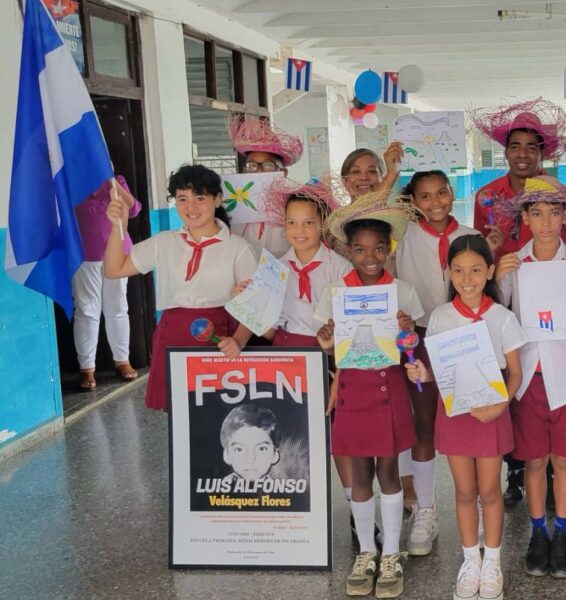 La Embajada entregó al Director de la Escuela, una fotografía de Luis Alfonso Velásquez Flores, que será la primera de las muchas fotos de niños y jóvenes heroicos que participaron en la Liberación y nuestras Gestas y Victorias Revolucionarias, que engalanarán la Escuela. El Director del Centro Escolar, agradeció la visita y el intercambio con los niños, que los estimula para aprender más sobre el General Sandino, la Lucha Sandinista, sobre los Niños y Jóvenes Héroes y Mártires de la Nicaragua Sandinista, tan Libre como Cuba.