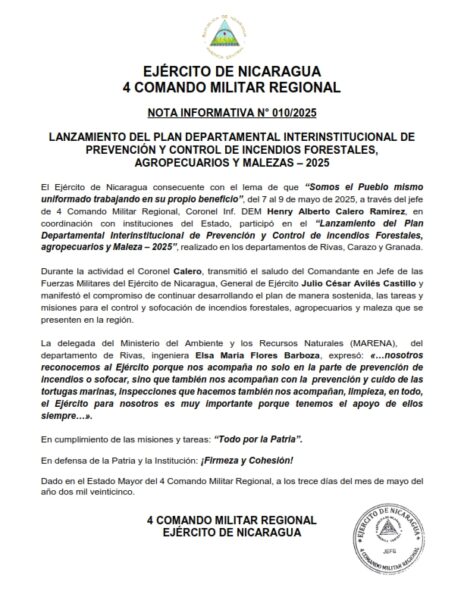 Del 7 al 9 de mayo de 2025, el Ejército de Nicaragua, a través del 4 Comando Militar Regional, participó en el lanzamiento del Plan Departamental Interinstitucional de Prevención y Control de Incendios Forestales, Agropecuarios y Malezas 2025, en los departamentos de Rivas, Carazo y Granada. Durante la actividad, el jefe del Comando, Coronel Henry Alberto Calero Ramírez, reafirmó el compromiso institucional de contribuir de manera sostenida en las labores de prevención, control y sofocación de incendios. Autoridades del MARENA destacaron el respaldo del Ejército en acciones ambientales como la protección de tortugas marinas e inspecciones territoriales.
