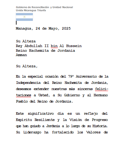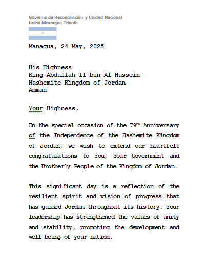 El Copresidente de Nicaragua, Comandante Daniel Ortega Saavedra, y la Copresidenta, Compañera Rosario Murillo, enviaron un mensaje de felicitación al Rey Abdullah II bin Al Hussein, en ocasión del 79° Aniversario de la Independencia del Reino Hachemita de Jordania. En la misiva, expresaron sus mejores deseos al monarca, al gobierno y al pueblo jordano, destacando el liderazgo y visión de progreso que han caracterizado al país. Asimismo, reafirmaron el compromiso de Nicaragua de continuar fortaleciendo los lazos de solidaridad, respeto y cooperación entre ambas naciones.
