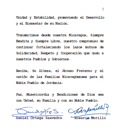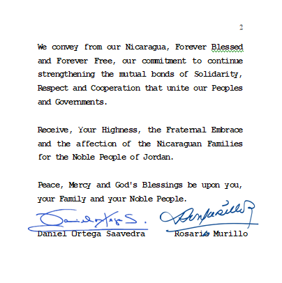 Reciba, Su Alteza, el Abrazo Fraterno y el cariño de las Familias Nicaragüenses para el Noble Pueblo de Jordania.