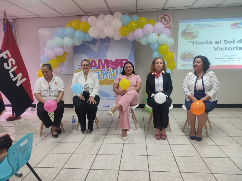 En el marco de celebración de la semana de la niñez, desarrollada por el Ministerio de la Familia, se llevó a cabo el Encuentro “Hacia el sol de Nuevas Victorias”. El objetivo de la actividad fue dar a conocer los principales logros y acciones realizados por el Gobierno de Reconciliación y Unidad Nacional a través de MIFAMILIA en pro de la restitución de los derechos de la niñez nicaragüense. En el encuentro estuvieron presentes niños y niñas de Centros de Desarrollo Infantil (CDI) presentando números artísticos y recibiendo obsequios por parte de las ponentes Johana Flores, Ministra de MIFAMILIA; Rosa Duarte, Responsable de Formación de Primera Infancia del referido ministerio; la Dra. María Gadea, del MINSA y la Cra. Yara Arauz, Directora de Educación Inicial del MINED.