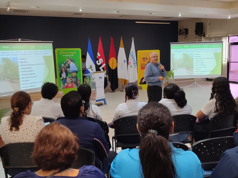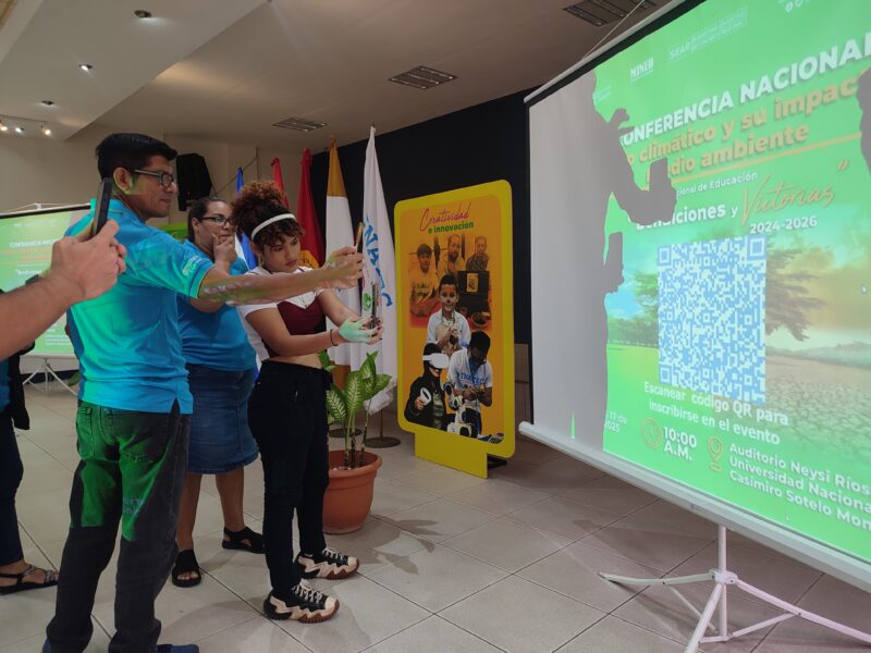 La actividad se enmarca en la Estrategia Nacional de Educación Bendiciones y Victorias 2024-2026, abordando sus ejes de Cambio Climático y Naturaleza y Medio Ambiente. Durante la conferencia se analizó el concepto de cambio climático y sus efectos actuales, reflejados en variaciones de temperatura, alteraciones en la biodiversidad y afectaciones en la flora y fauna. Al respecto, Yalí Blandón, responsable de la unidad de gestión ambiental del MINED, enfatizó que estos impactos no solo afectan el entorno natural, sino también la salud de las poblaciones.