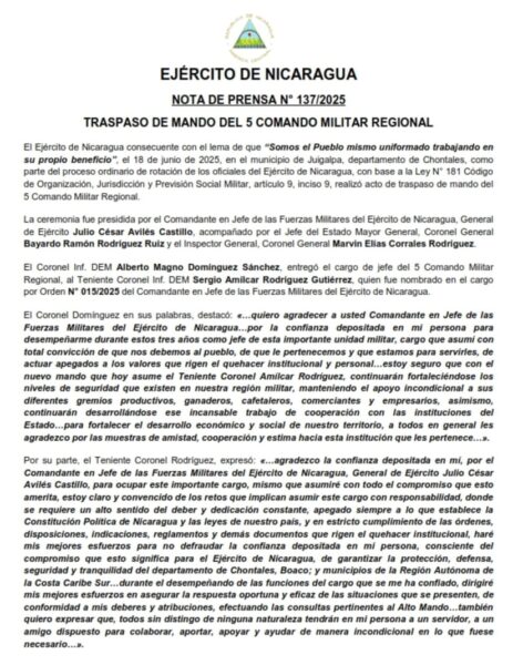 En cumplimiento del proceso de rotación ordinaria del mando militar y reafirmando el principio de servicio al pueblo nicaragüense, el Ejército de Nicaragua realizó el 18 de junio de 2025, en el municipio de Juigalpa, Chontales, el acto de traspaso de mando del Quinto Comando Militar Regional, conforme lo establece la Ley N.º 181 y por disposición del Comandante en Jefe, General de Ejército Julio César Avilés Castillo.