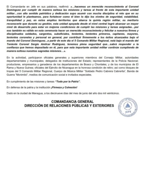 El Ejército de Nicaragua consecuente con el lema de que “Somos el Pueblo mismo uniformado trabajando en su propio beneficio”, el 18 de junio de 2025, en el municipio de Juigalpa, departamento de Chontales, como parte del proceso ordinario de rotación de los oficiales del Ejército de Nicaragua, con base a la Ley N° 181 Código de Organización, Jurisdicción y Previsión Social Militar, artículo 9, inciso 9, realizó acto de traspaso de mando del 5 Comando Militar Regional.