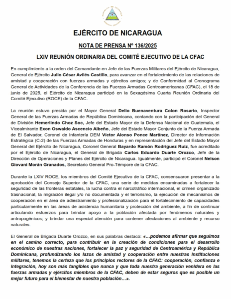 En cumplimiento a la orden del Comandante en Jefe de las Fuerzas Militares del Ejército de Nicaragua, General de Ejército Julio César Avilés Castillo, para avanzar en el fortalecimiento de las relaciones de amistad y cooperación con fuerzas armadas y ejércitos amigos; y de Conformidad al Cronograma General de Actividades de la Conferencia de las Fuerzas Armadas Centroamericanas (CFAC), el 18 de junio de 2025, el Ejército de Nicaragua participó en la Sexagésima Cuarta Reunión Ordinaria del Comité Ejecutivo (ROCE) de la CFAC.