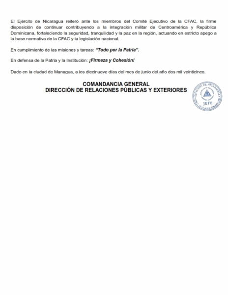 El Ejército de Nicaragua reiteró ante los miembros del Comité Ejecutivo de la CFAC, la firme disposición de continuar contribuyendo a la integración militar de Centroamérica y República Dominicana, fortaleciendo la seguridad, tranquilidad y la paz en la región, actuando en estricto apego a la base normativa de la CFAC y la legislación nacional.