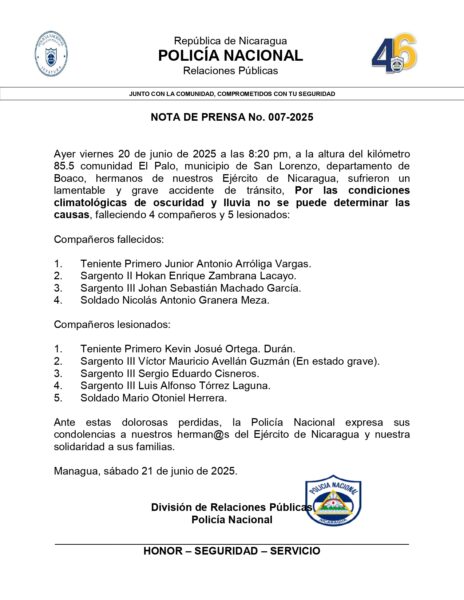 Ayer viernes 20 de junio de 2025 a las 8:20 pm, a la altura del kilómetro 85.5 comunidad El Palo, municipio de San Lorenzo, departamento de Boaco, hermanos de nuestros Ejército de Nicaragua, sufrieron un lamentable y grave accidente de tránsito, Por las condiciones climatológicas de oscuridad y lluvia no se puede determinar las causas, falleciendo 4 compañeros y 5 lesionados: