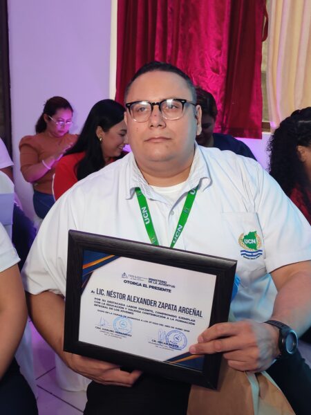 La docente Sara Mora, del área de Bienestar Estudiantil de la Universidad Central de Nicaragua (UCN), expresó su agradecimiento por el reconocimiento recibido, destacando la relación de colaboración entre la universidad y el Ministerio de la Juventud.