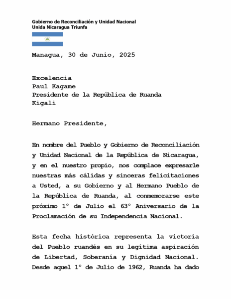En nombre del Pueblo y Gobierno de Reconciliación y Unidad Nacional de la República de Nicaragua, y en el nuestro propio, nos complace expresarle nuestras más cálidas y sinceras felicitaciones a Usted, a su Gobierno y al Hermano Pueblo de la República de Ruanda, al conmemorarse este próximo 1º de Julio el 63º Aniversario de la Proclamación de su Independencia Nacional.