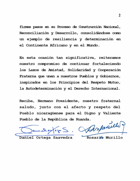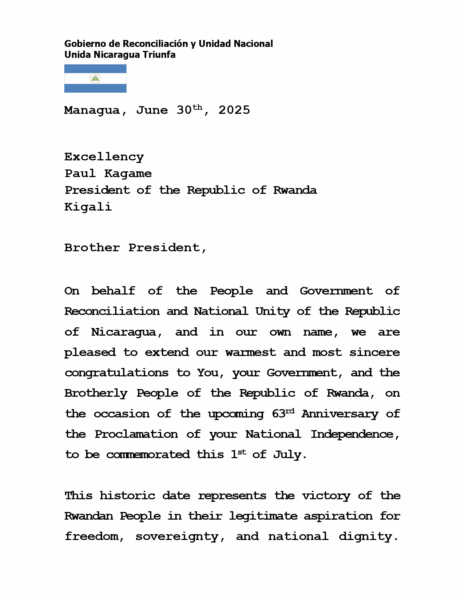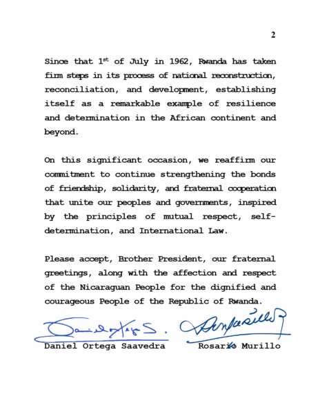 On behalf of the People and Government of Reconciliation and National Unity of the Republic of Nicaragua, and in our own name, we are pleased to extend our warmest and most sincere congratulations to You, your Government, and the Brotherly People of the Republic of Rwanda, on the occasion of the upcoming 63rd Anniversary of the Proclamation of your National Independence, to be commemorated this 1st of July.