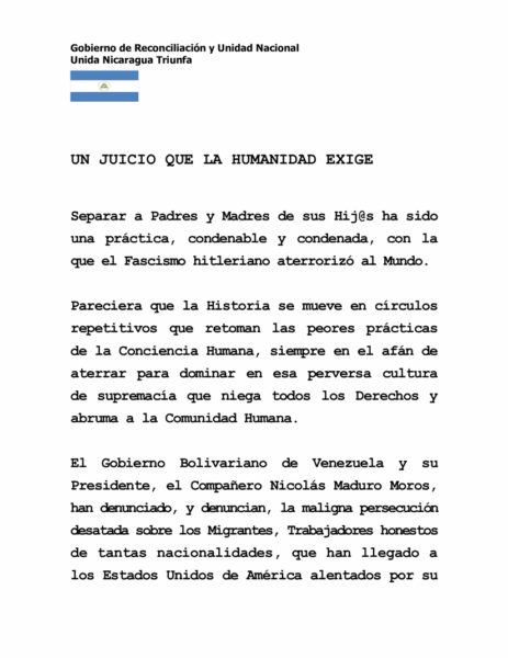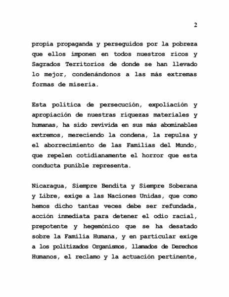 Nicaragua, Siempre Bendita y Siempre Soberana y Libre, exige a las Naciones Unidas, que como hemos dicho tantas veces debe ser refundada, acción inmediata para detener el odio racial, prepotente y hegemónico que se ha desatado sobre la Familia Humana, y en particular exige a los politizados Organismos, llamados de Derechos Humanos, el reclamo y la actuación pertinente, para lograr detener estos crímenes y devolver a las Familias su integridad y respeto.