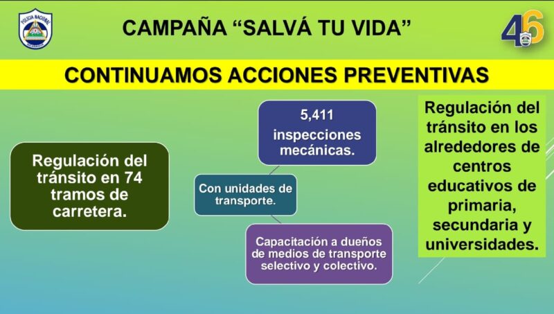 En el marco de la campaña permanente “Salvá tu vida”, la Policía Nacional continuó con acciones preventivas y de regulación del tránsito. Se brindó control en 74 tramos de carretera con alta circulación de unidades de transporte y se efectuaron 5,411 inspecciones mecánicas. Además, se desarrollaron jornadas de capacitación dirigidas a conductores de transporte selectivo y colectivo.