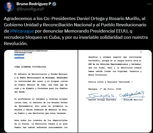 El ministro de Relaciones Exteriores de Cuba, Bruno Rodríguez Parrilla, agradeció al Comandante Daniel Ortega, a la Cra. Rosario Murillo, al Gobierno de Reconciliación y Unidad Nacional, y al pueblo revolucionario de Nicaragua, por su firme y solidaria postura frente al nuevo intento de agresión del Gobierno de Estados Unidos contra la isla.
