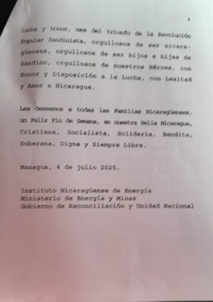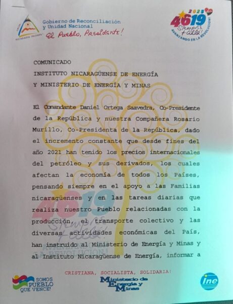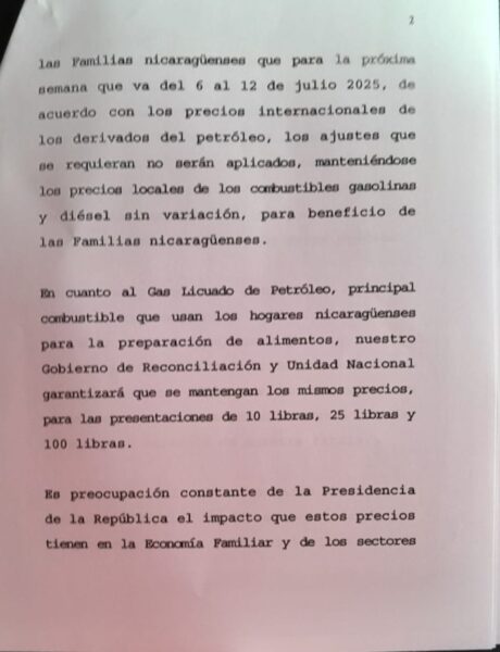 El Comandante Daniel Ortega Saavedra, Copresidente de la República y nuestra Compañera Rosario Murillo, Copresidenta de la República, dado el incremento constante que desde el año 2021 han tenido los precios internacionales del petróleo y sus derivados, los cuales afectan las economías de todos los países, pensando siempre en el apoyo a las familias nicaragüenses y en las tareas diarias que realiza nuestro pueblo relacionadas con la producción, el transporte colectivo y las diversas actividades económicas del país, han instruido al Ministerio de Energía y Minas y al Instituto Nicaragüense de Energía, informar a las familias nicaragüenses que para la próxima semana que va del 6 al 12 de julio 2025, de acuerdo con los precios internacionales de los derivados del petróleo, los ajustes que se requieran no serán aplicados, manteniéndose los precios locales de los combustibles gasolinas y diésel sin variación, para beneficio de las familias nicaragüenses.