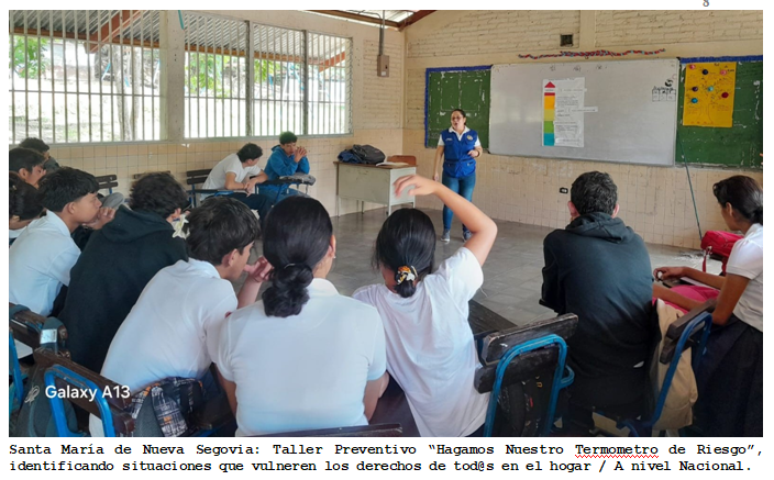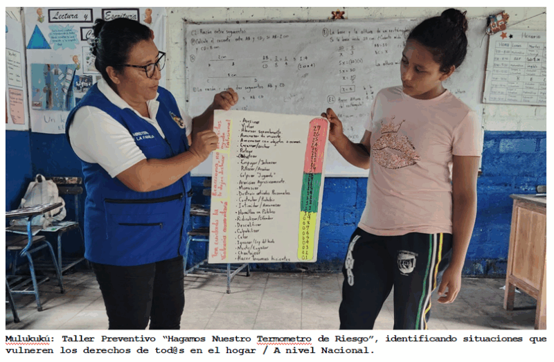 Del 7 al 8 de julio, el Ministerio de la Familia, Adolescencia y Niñez (MIFAMILIA) desarrolló el Taller Preventivo “Hagamos Nuestro Termómetro de Riesgo”, una jornada socioeducativa y creativa que reunió a más de 100 líderes comunitarios, 596 adolescentes y jóvenes en distintos espacios del país. El objetivo fue identificar, desde lo cotidiano, señales de alerta que afectan la armonía familiar y vulneran los derechos de niñas, niños, adolescentes, mujeres y personas adultas mayores.