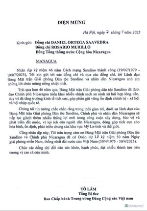 En el marco del 46.º Aniversario del Triunfo de la Revolución Popular Sandinista, el Comité Central del partido Comunista de Vietnam hizo llegar un mensaje de felicitación al Frente Sandinista de Liberación Nacional (FSLN) y al pueblo de Nicaragua, destacando los avances sociales, la estabilidad política y el papel del país en la integración regional durante las últimas décadas.