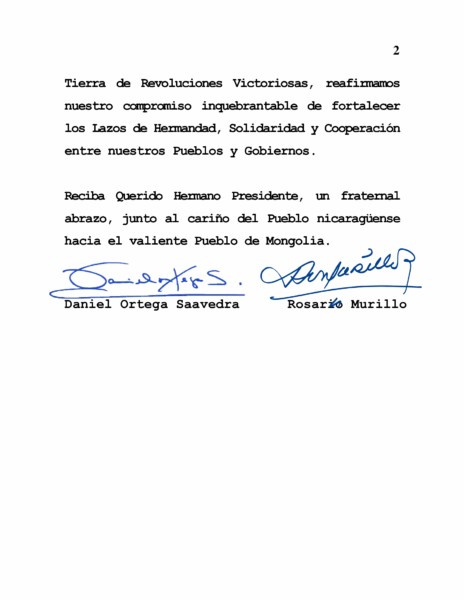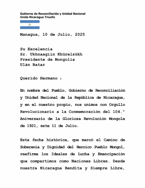 En nombre del Pueblo, Gobierno de Reconciliación y Unidad Nacional de la República de Nicaragua, y en el nuestro propio, nos unimos con Orgullo Revolucionario a la Conmemoración del 104.º Aniversario de la Gloriosa Revolución Mongola de 1921, este 11 de Julio.