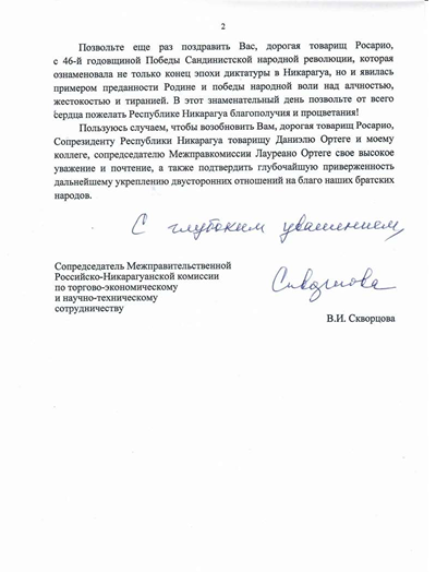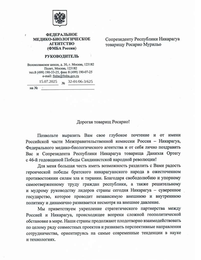 Permítame expresarle a Usted mi más profundo respeto y de la parte rusa de la Comisión Intergubernamental Rusia Nicaragua, de la Agencia Federal Médico-Biológica y de mi propia parte felicitarla a Usted y al Copresidente de la República de Nicaragua compañero Daniel Ortega ¡con el 46to aniversario de la Victoria de la Revolución Popular Sandinista!