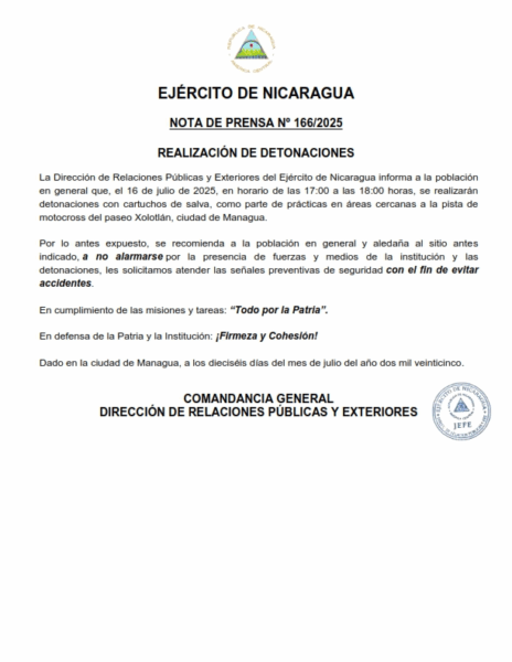 La Dirección de Relaciones Públicas y Exteriores del Ejército de Nicaragua informa a la población en general que, el 16 de julio de 2025, en horario de las 17:00 a las 18:00 horas, se realizarán detonaciones con cartuchos de salva, como parte de prácticas en áreas cercanas a la pista de motocross del paseo Xolotlán, ciudad de Managua.