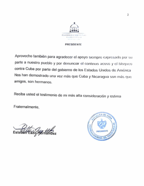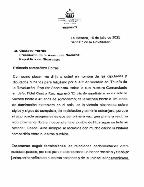 El Compañero Esteban Lazo Hernández, Presidente de la Asamblea Nacional del Poder Popular de Cuba, ha enviado un Mensaje de Saludo y Felicitación con motivo del 46/19. Compartimos este comunicado oficial como muestra del acompañamiento del Parlamento cubano en esta fecha conmemorativa.