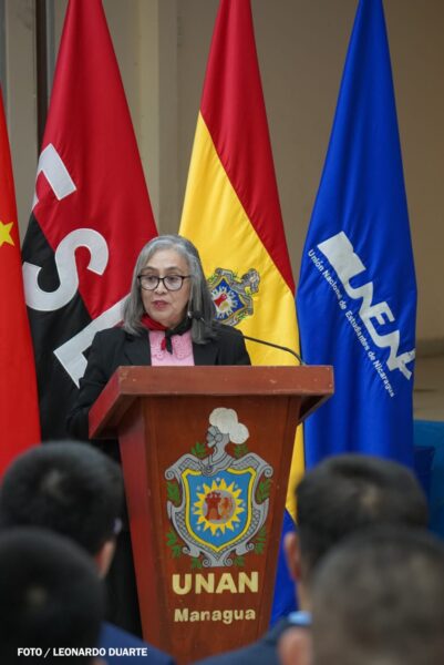 La maestra Ángela Munguía Beteta, rectora de la UNAN-Managua, brindó un mensaje de bienvenida en el que destacó la importancia estratégica del encuentro y el valor del intercambio académico entre ambas naciones. Reconoció «la profunda historia, cultura y sabiduría del gran pueblo chino», subrayando que el pensamiento del presidente Xi Jinping y los principios del Partido Comunista de China han sido claves para el desarrollo económico, político y social de esa nación asiática.
