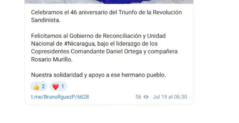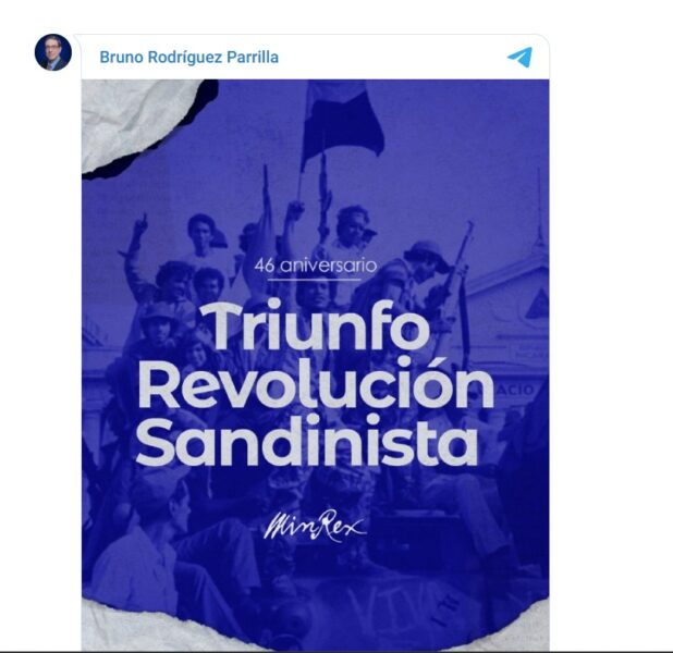 En un gesto de hermandad revolucionaria, el Ministro de Relaciones Exteriores de Cuba, compañero Bruno Rodríguez, compartió este 19 de julio en su canal de Telegram un mensaje de felicitación al valiente pueblo nicaragüense, al conmemorarse 46 años del Triunfo de la Revolución Sandinista. Su saludo reafirma los lazos históricos entre Cuba y Nicaragua, unidos por la lucha, la dignidad y la soberanía de nuestros pueblos.