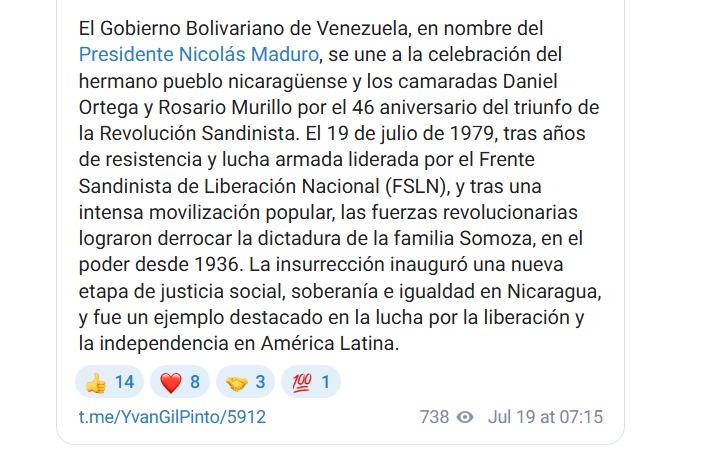 En el marco del 46 aniversario del Triunfo de la Revolución Popular Sandinista, el compañero Yván Gil, Ministro de Relaciones Exteriores de la República Bolivariana de Venezuela, compartió un mensaje en su canal de Telegram celebrando junto al pueblo nicaragüense esta fecha histórica. Su publicación reafirma los profundos lazos de hermandad, lucha y solidaridad que unen a Venezuela y Nicaragua en su camino revolucionario por la soberanía de los pueblos.