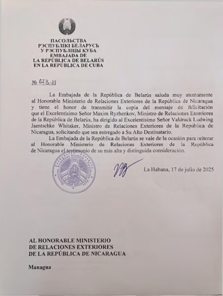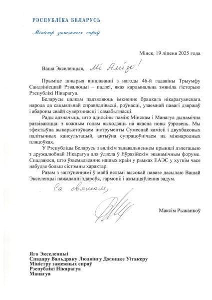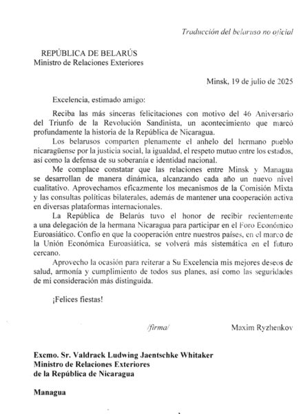 Compartimos con orgullo el mensaje de felicitaciones enviado por el Ministro de Relaciones Exteriores de la República de Belarús, camarada Maksim Ryzhenkov, dirigido al valiente pueblo y al Gobierno de Nicaragua con motivo del 46 aniversario del Triunfo de la Revolución Popular Sandinista. En su saludo, el Ministro Ryzhenkov expresa sus mejores deseos de paz, prosperidad y continuo desarrollo para la nación nicaragüense, reafirmando los lazos de amistad y cooperación que unen a ambos países en la lucha por un mundo más justo y solidario.